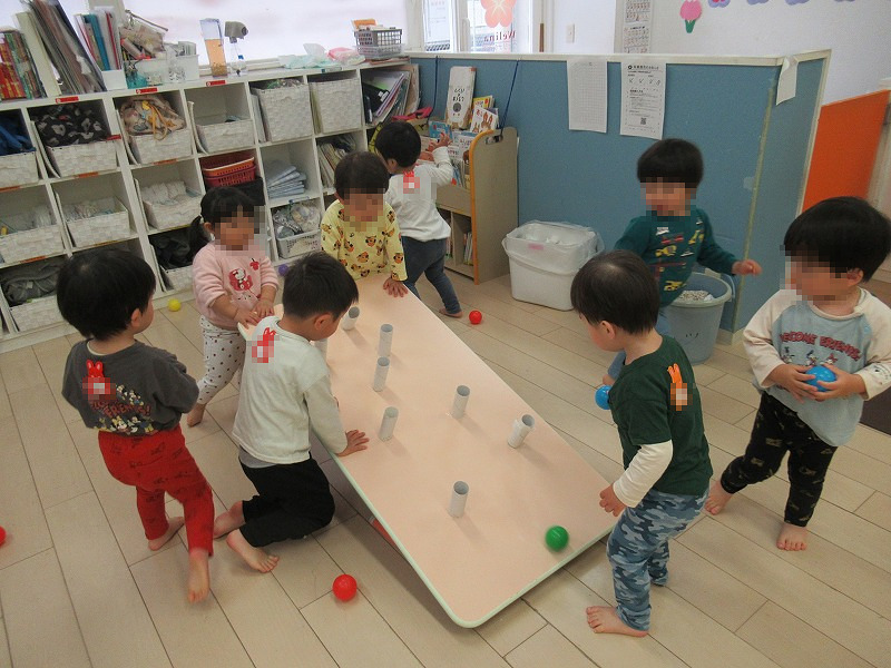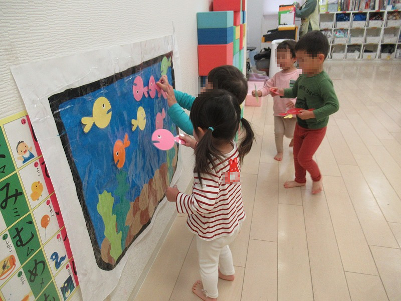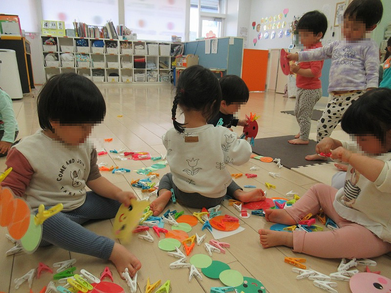 写真は設定保育の一例「お魚ぺったん」「洗濯ばさみ遊び」「障害物コロコロ」。