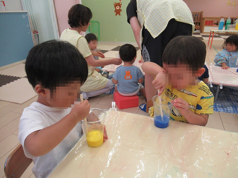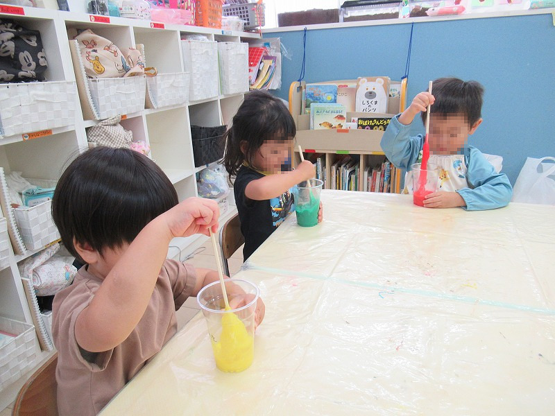 今週の工作ではスライムを作りました。好きな色の色水を選んで〜ホウ砂を入れたら〜まぜまぜまぜまぜ♪はぁ〜、まぜまぜまぜまぜ〜♪