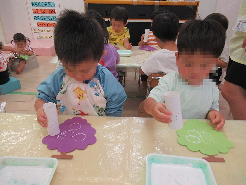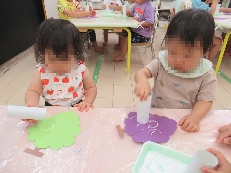 スタンプ工作、トイレットペーパーの芯を使ってぶどうの房をペッタンペッタン♪