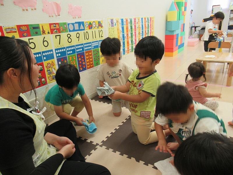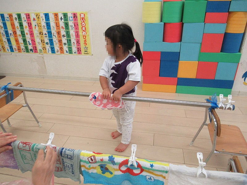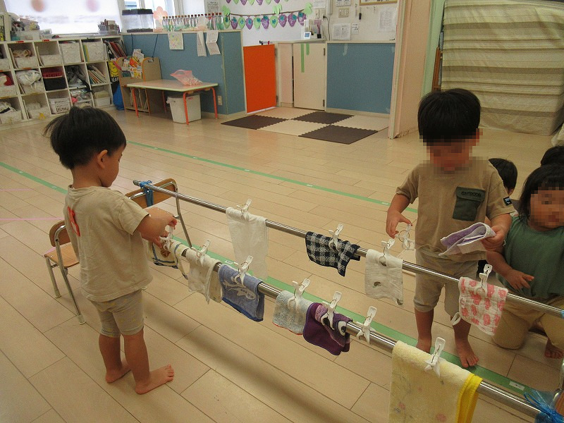 一晩乾かして〜♪洗濯ものを取り込んだら〜♪伸ばしてキレイにたたんでいきます。たたみ終えた洗濯物をジッと見つめて「にまぁ〜♪」満足そうな笑顔をうかべる子ども達でした(^o^)/