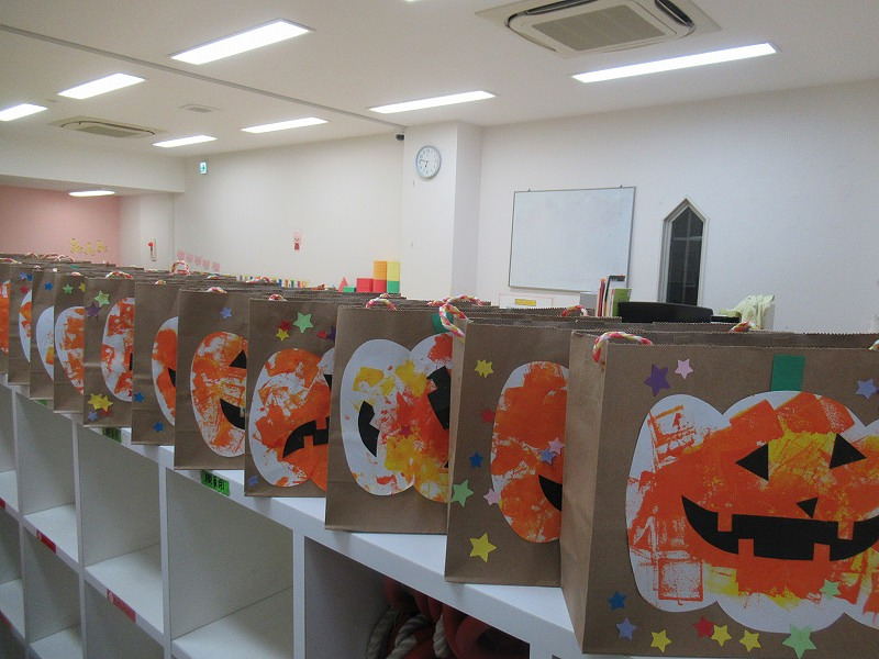 たくさんお菓子を回収すべく、子ども達は真剣な表情でお菓子回収バックを作っています(笑)みんながんばれー!