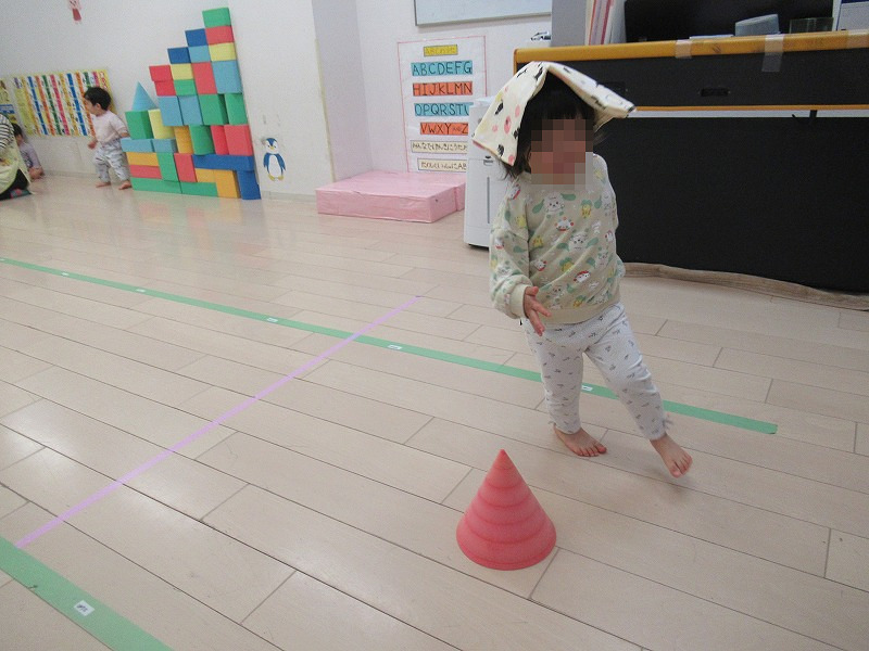 頭にタオルを乗せて落とさないようにソローリ・ソローリ。