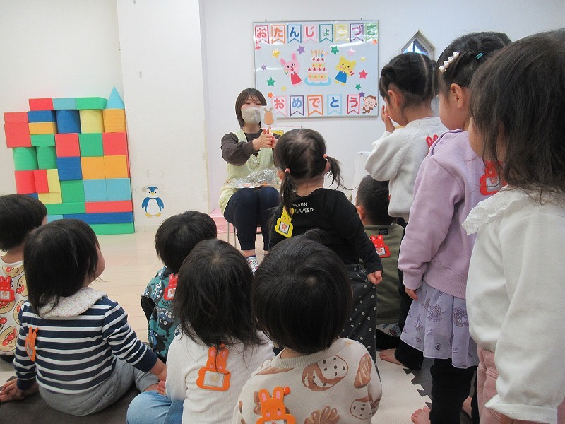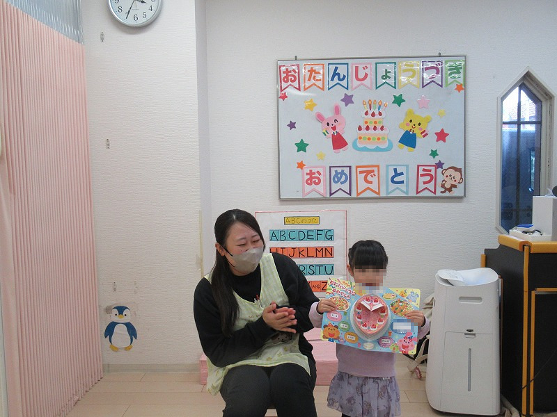 12月はTちゃんのお誕生月。恒例の先生方の出し物を楽しんだら、バースディカードを受け取って♪みんなでお歌のプレゼント♪手作りショートケーキ、牛乳でカンパーイ!