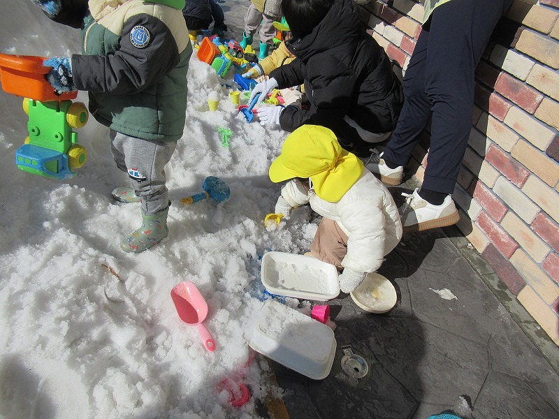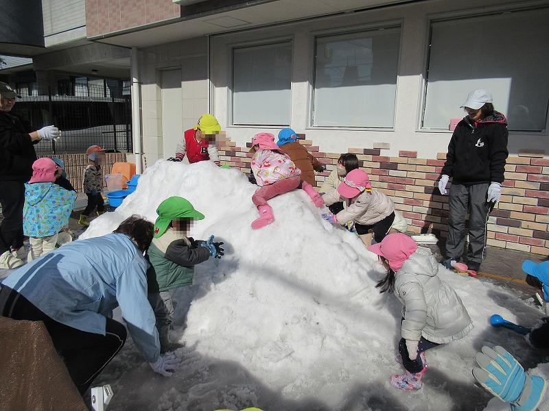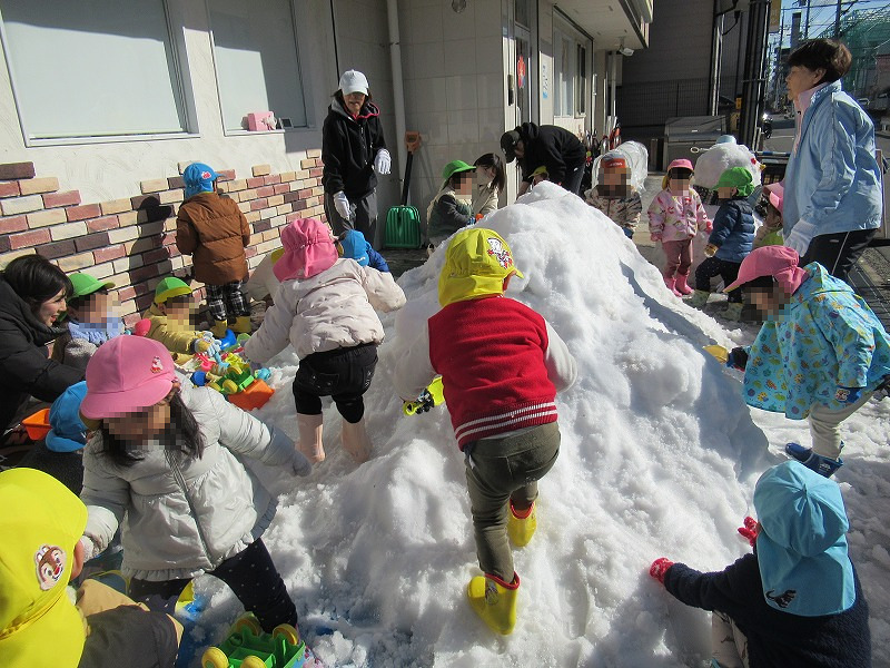 特別設定戸外遊びの一つとして12年前に始めた雪遊び(^-^)ある園児の「雪って見たことな〜い」の一言が当時50才の園長の心に火をつけました(笑)しかし今年の雪取りは寒波での路面凍結、62才園長の真夜中の2tトラック運転、怖かった〜