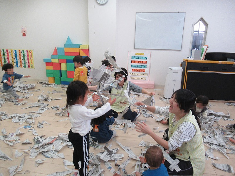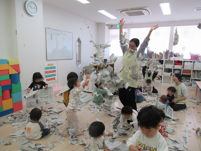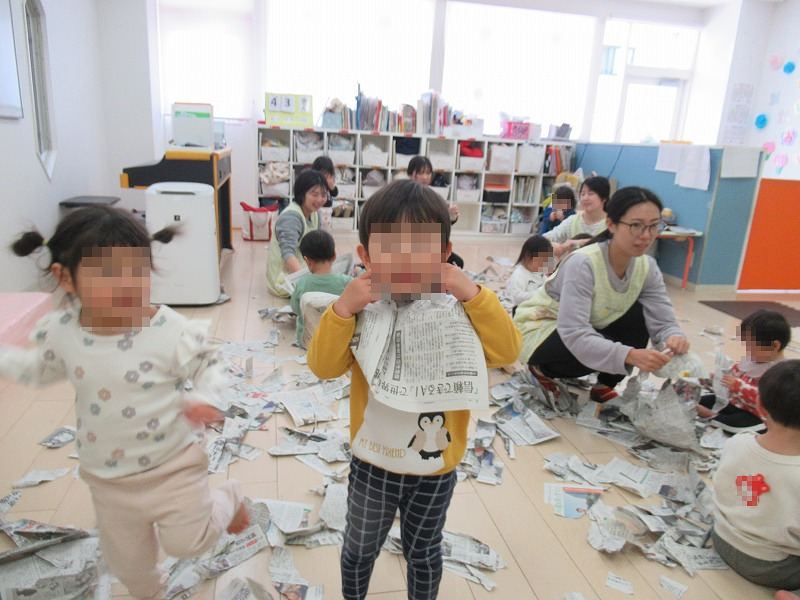 新聞紙をビリビリ〜♪子ども達は大興奮(笑)、楽しそう!