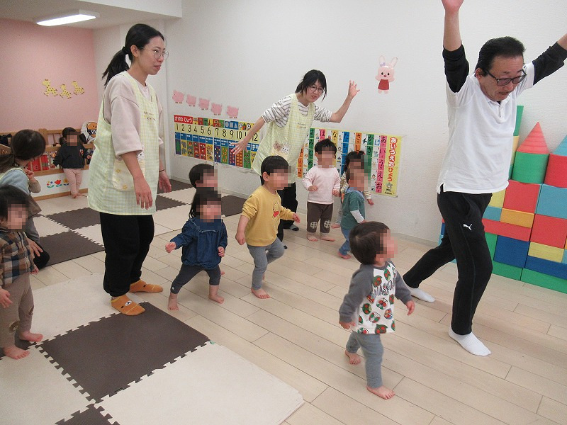 今年度最初の体育プログラムは運動機能確認。月齢に応じての主体的運動機能をチェックします。