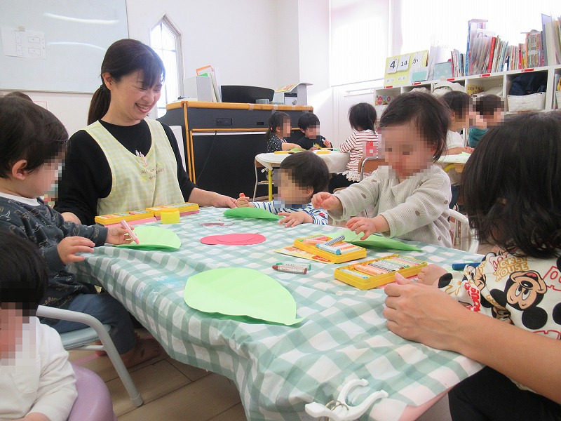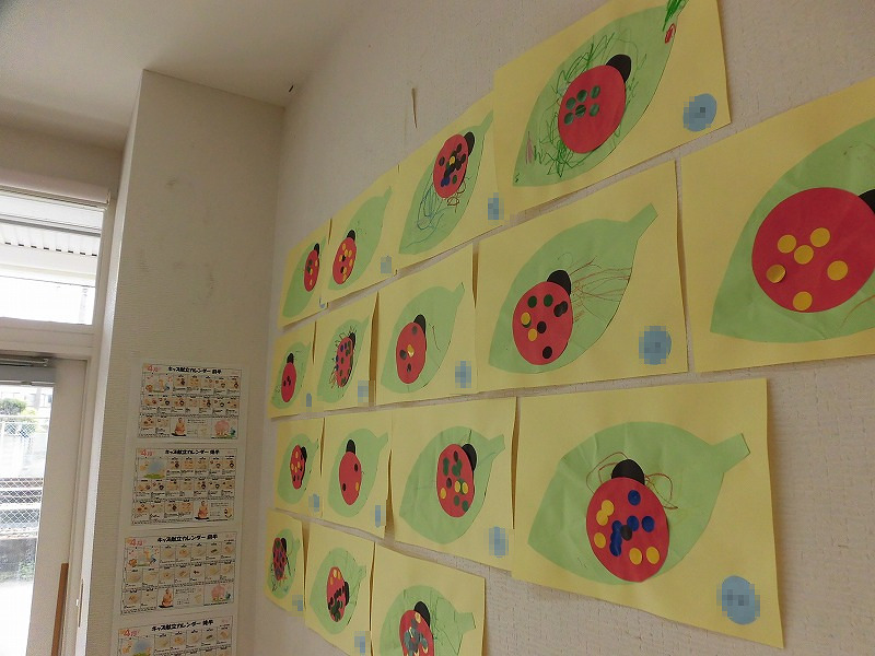 下の写真は工作の時間、新入園児は約10分、先輩園児は20分の集中で個性豊かな可愛いテントウムシさんが(^-^)/