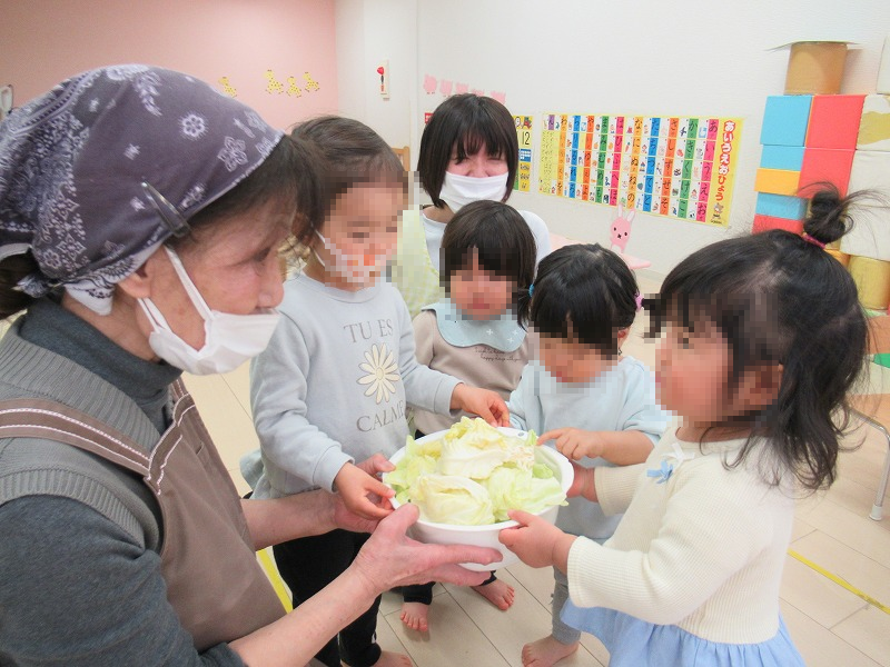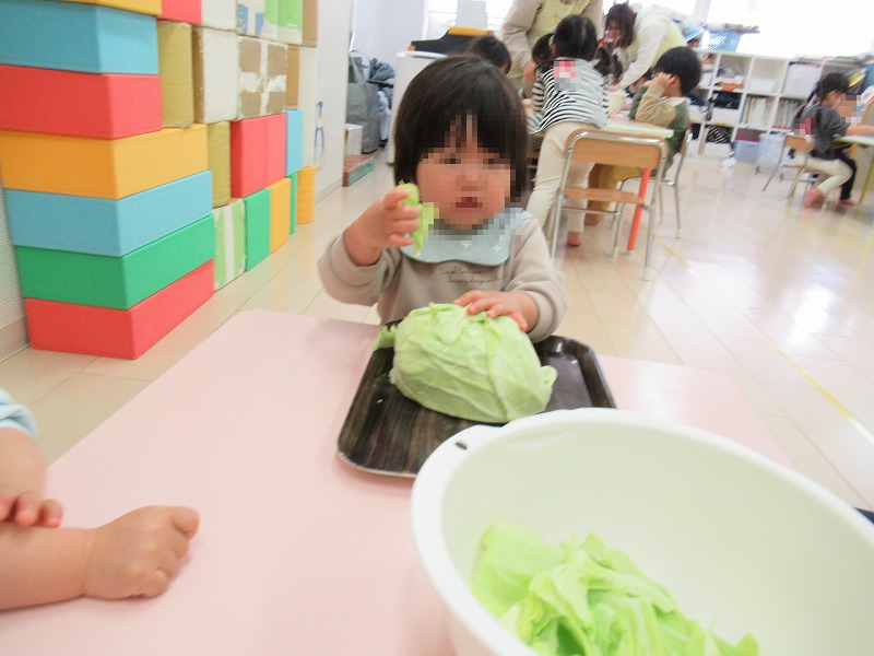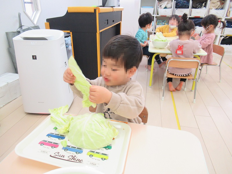 今週の食育はキャベツの皮むきをしました。むいたり、ちぎったり・・子天使ちゃん達の大好きな作業です(^-^)。みんな半笑いながらも集中しています(笑)。