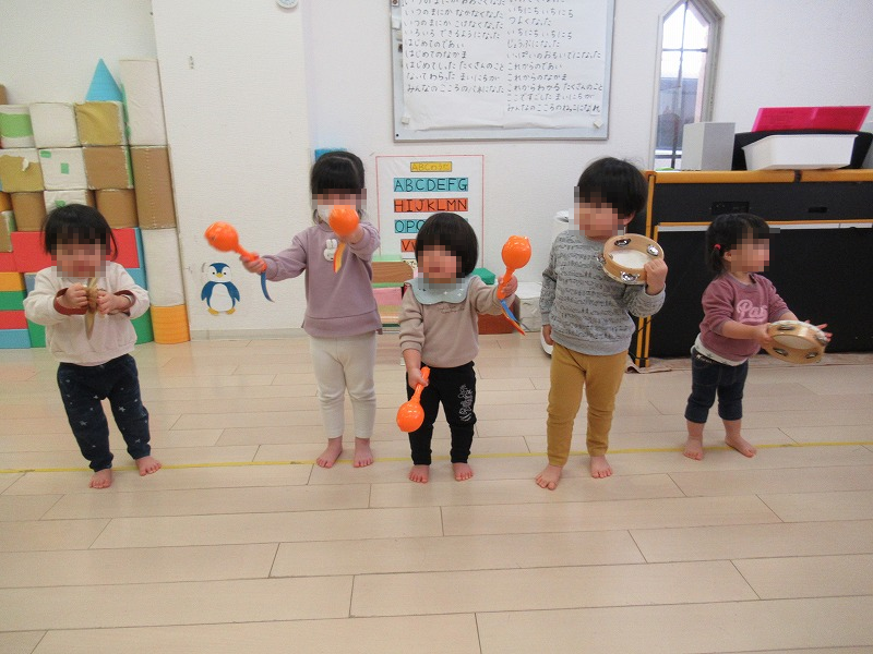 写真は2才児さんの楽器遊びに無理やり割り込み参加してきた0才児さん2名(笑)。