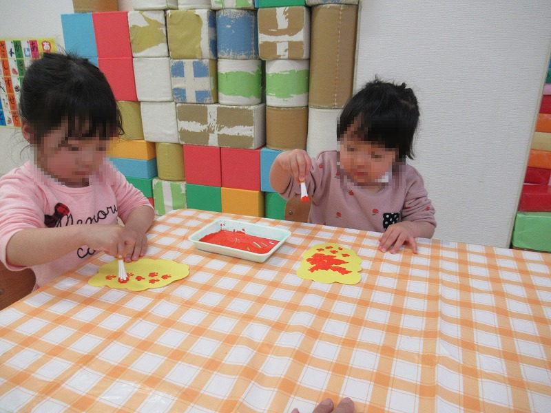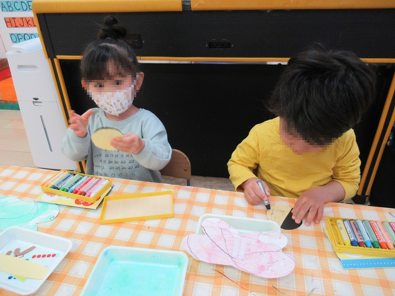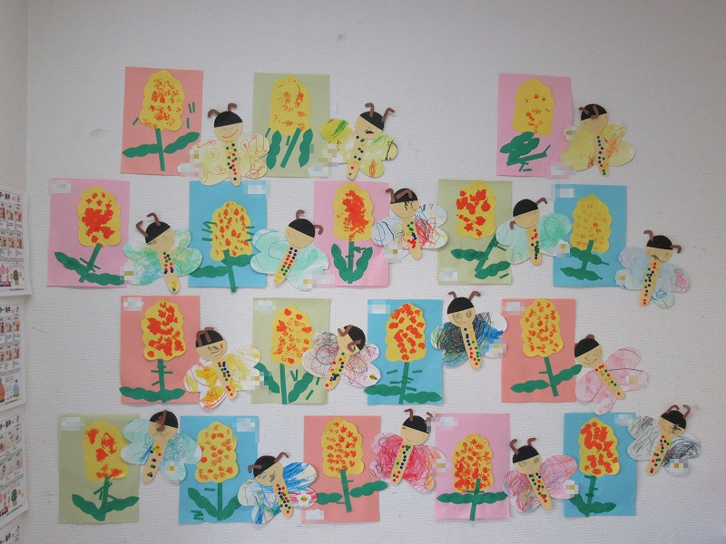 先週の工作はスタンプを使っての菜の花。今週の工作は蝶々を作りました。合わせてエントランスに。蝶々が飛び交う菜の花畑の完成です。
