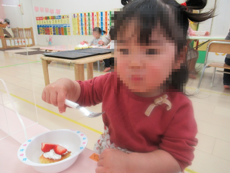 Kちゃん満2歳のお誕生月。恒例の先生たちによる出し物が終わったら、バースデーカードのプレゼント。みんなでお歌のプレゼント。給食士さんの手作りケーキと牛乳でカンパーイ!