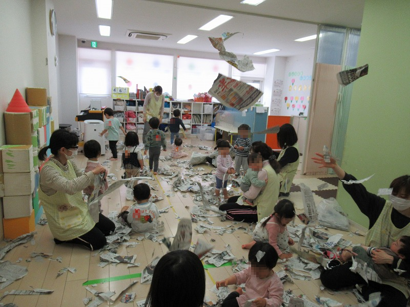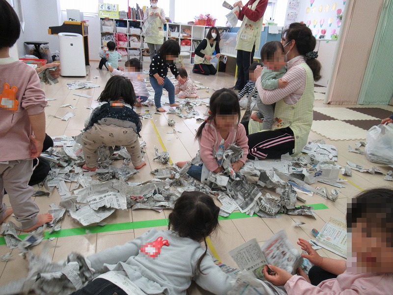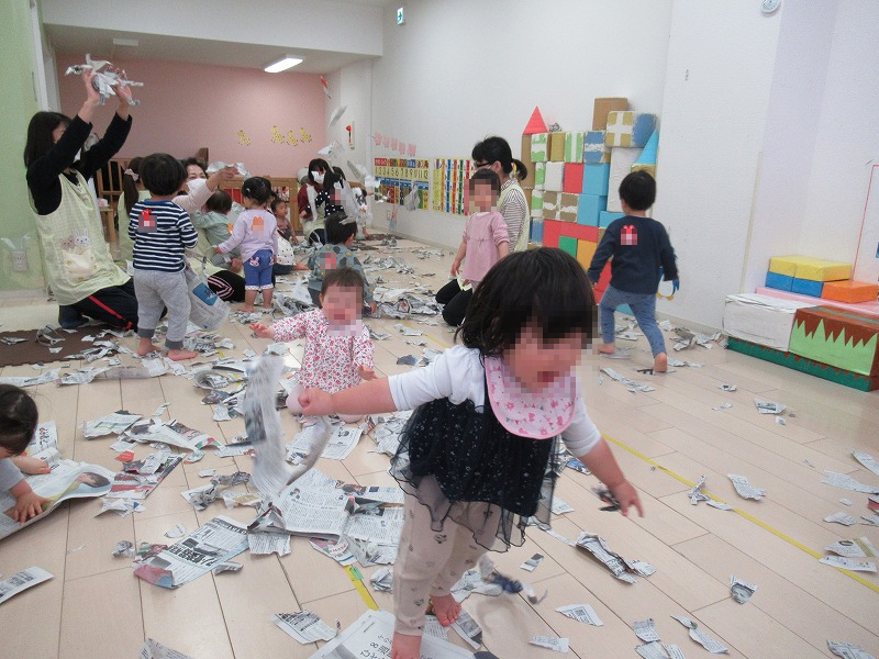 慣れ保育の定番設定保育の第3弾は「新聞紙散らかし遊び」(^-^)。新入子天使ちゃんだけでなく上級生もみんなが大好きな設定保育なんです。