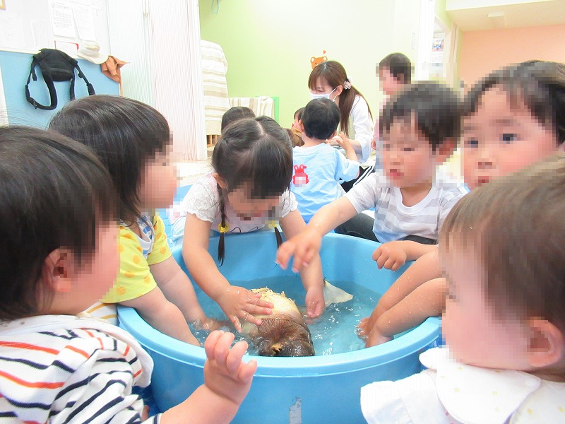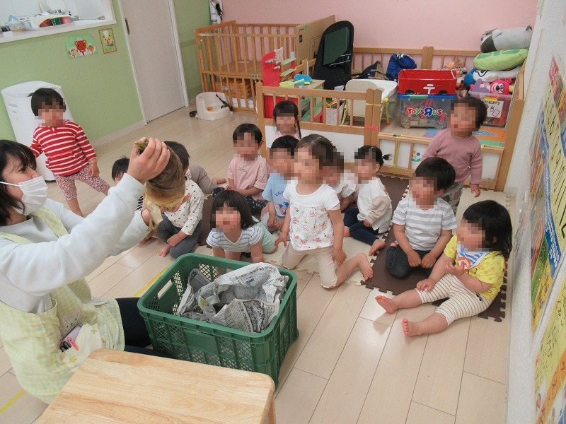 前日、園長が知り合いの竹林にタケノコ掘りに行ってきました。タケノコ(竹の子ども)のお話を先生から聞く子天使ちゃん達の目は興味津々キラキラしています。
