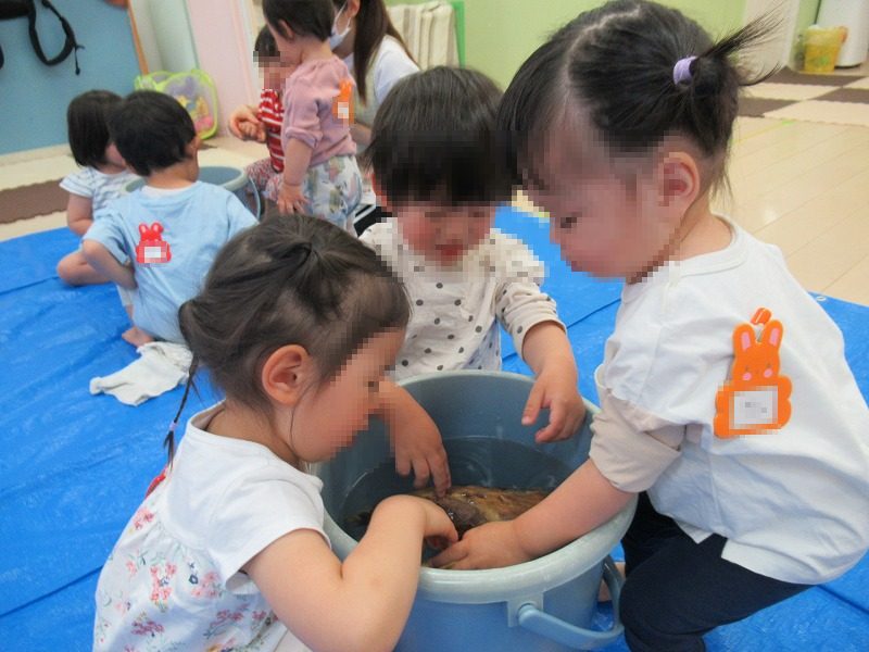 掘りたてのタケノコの土をタライやバケツで丁寧に落とします。ジャブジャブジャブジャブ♪シャカシャカシャカシャカ♪タケノコの土落とし、楽しそう(^-^)/