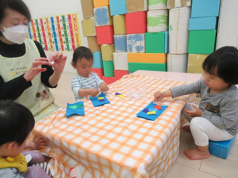 糊を指で使ってうろこを貼っていきます。はじめて糊を触る新入子天使ちゃんの戸惑う姿、可愛い〜(^o^)♪