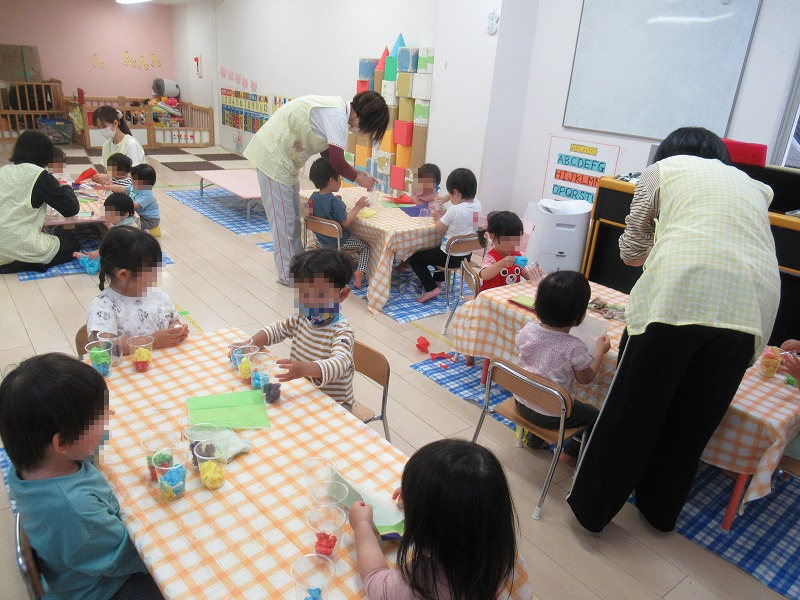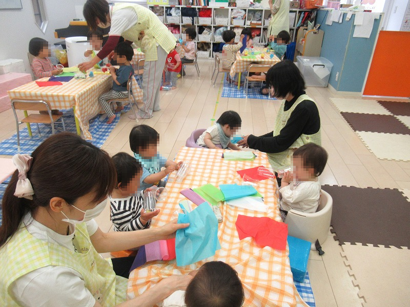 お花紙をクシャクシャクシャクシャ♪コップにつめつめつめつめ♪お顔作りに糊をペタペタペタペタ♪みんな集中力、すごーい!