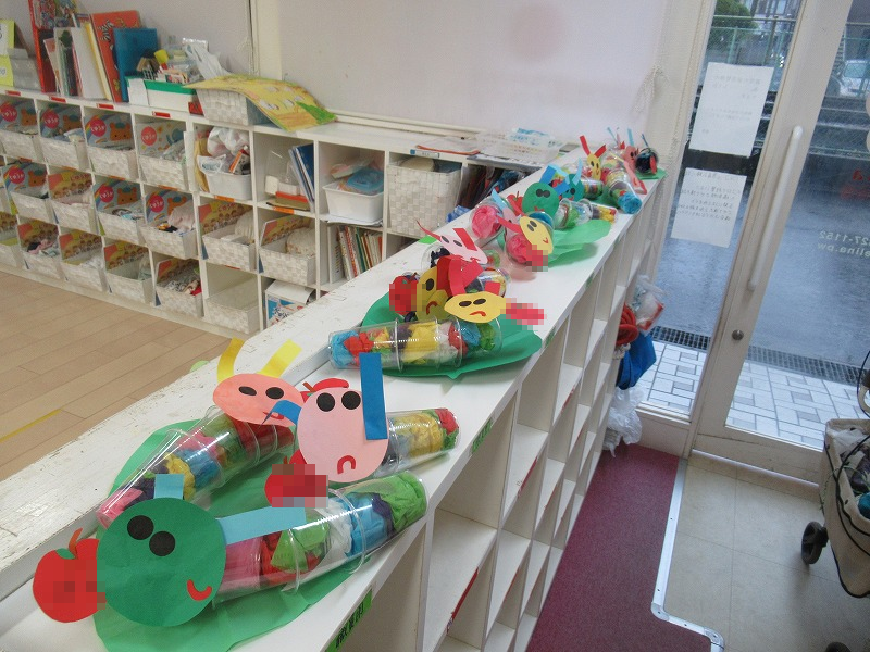 季節に合わせて、あおむしを作ってみました。先生からあおむしのお話を聞いたら〜、工作かいしー♪