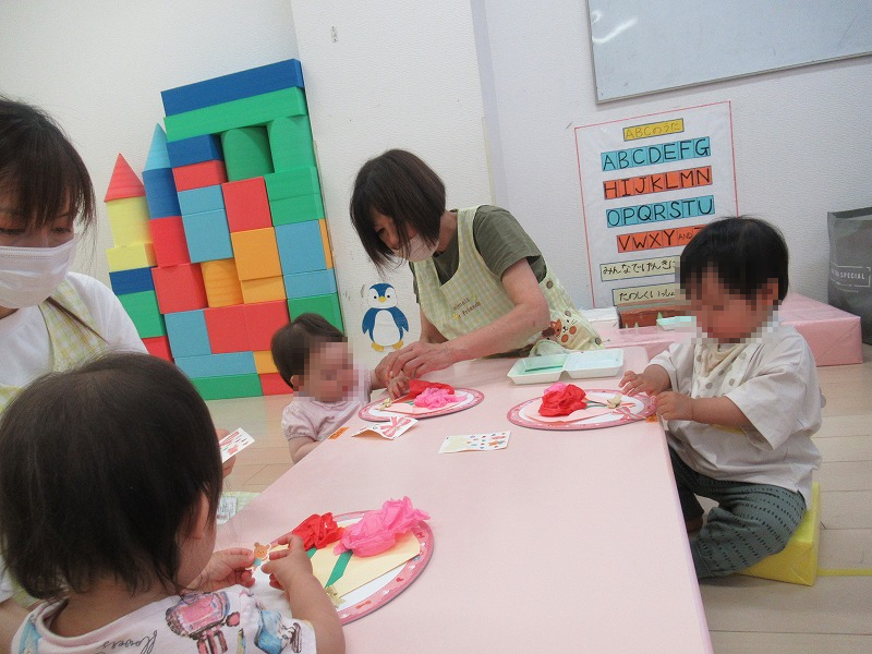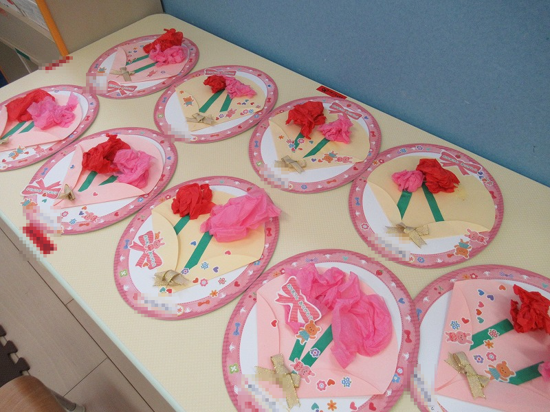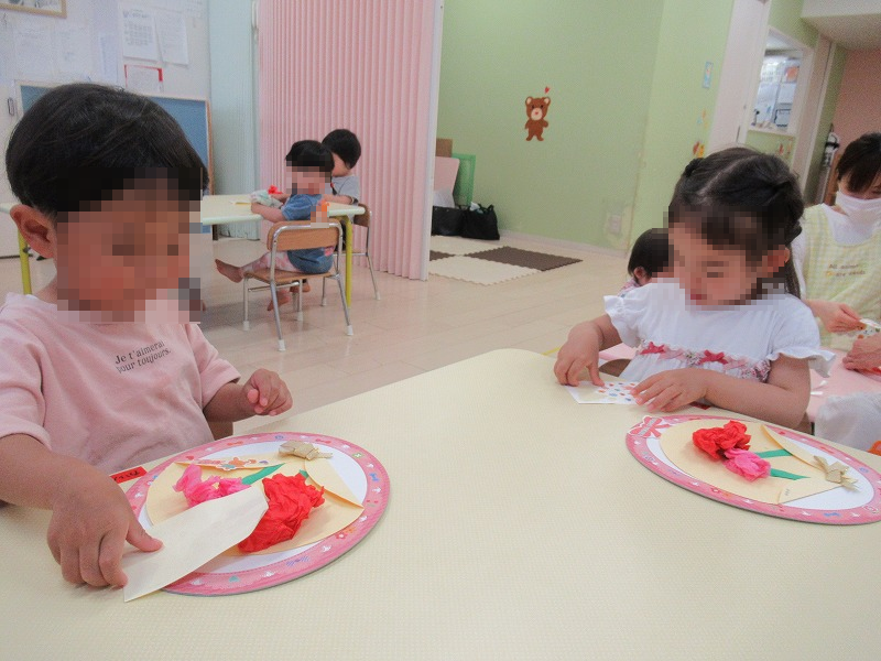 工作の前に先生から「みんなーお母さん好き?」のお話を聞いて子ども達、もちろん「大好きー!」の元気なお返事♪