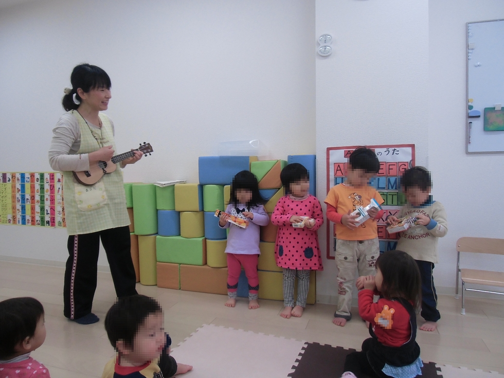 右下写真は昨日の設定保育の時間、M先生のウクレレと子天使ちゃん達の手作りウクレレの合奏です。(^0^)