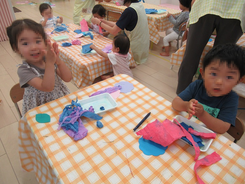 次の日にクシャとして葉っぱに貼り付け♪子ども達の集中力すごーい!。