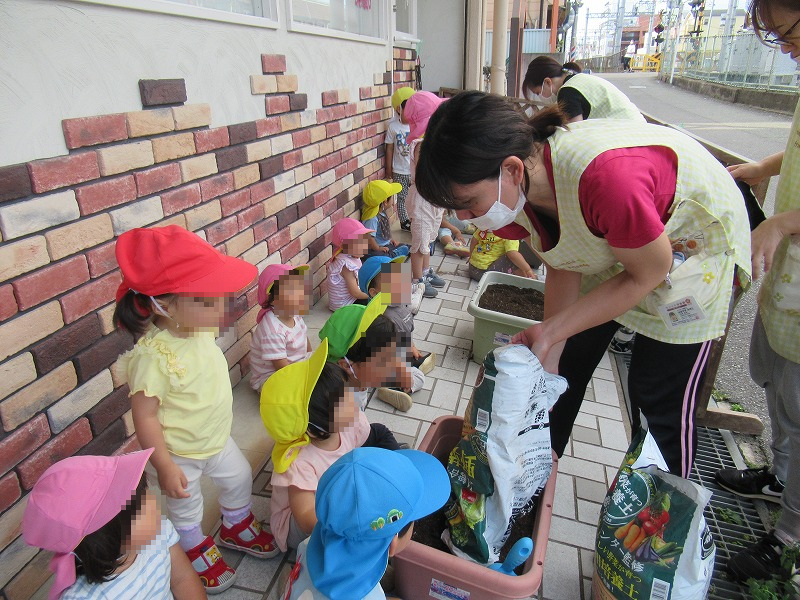 子天使ちゃん達、興味津々、自ら苗を植えてくれます。