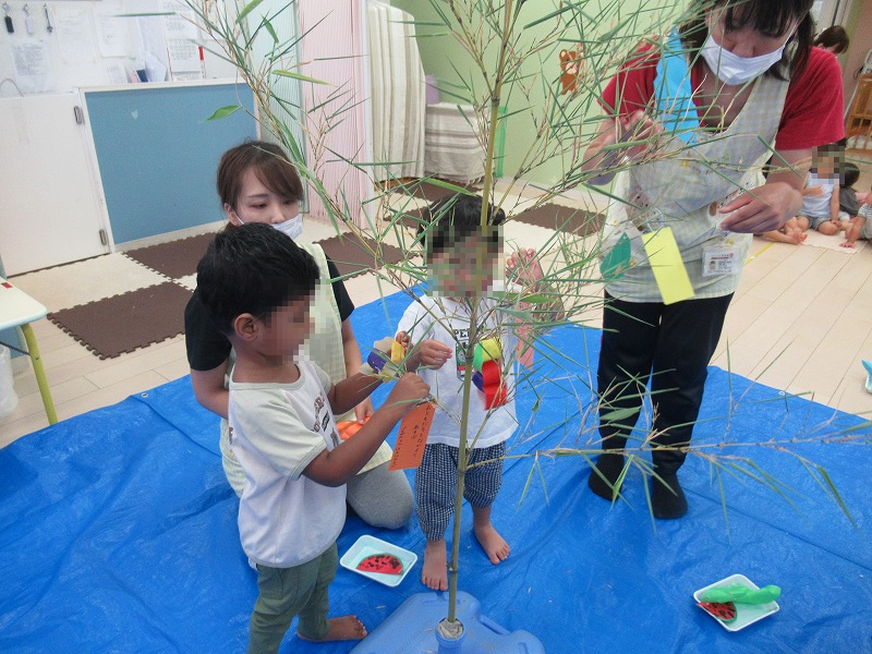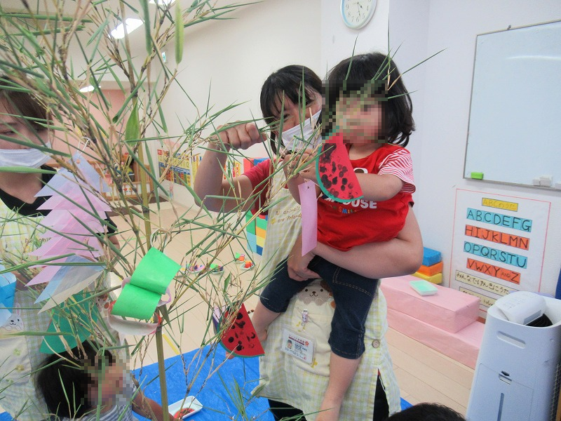 この日は笹飾りを笹に飾っていきました。自分たちで作った笹飾りをひとつひとつ丁寧に飾り付ける子天使ちゃん達♪(^-^)