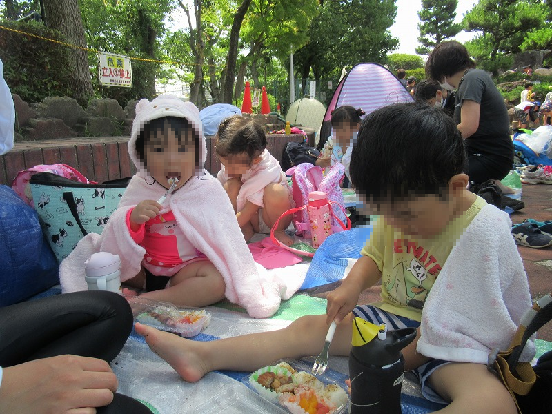 水遊びを満喫したらお弁当タイムー!(給食士さんが朝6時に出勤して作ってくれました)パクパクモグモグ美味しいね♪