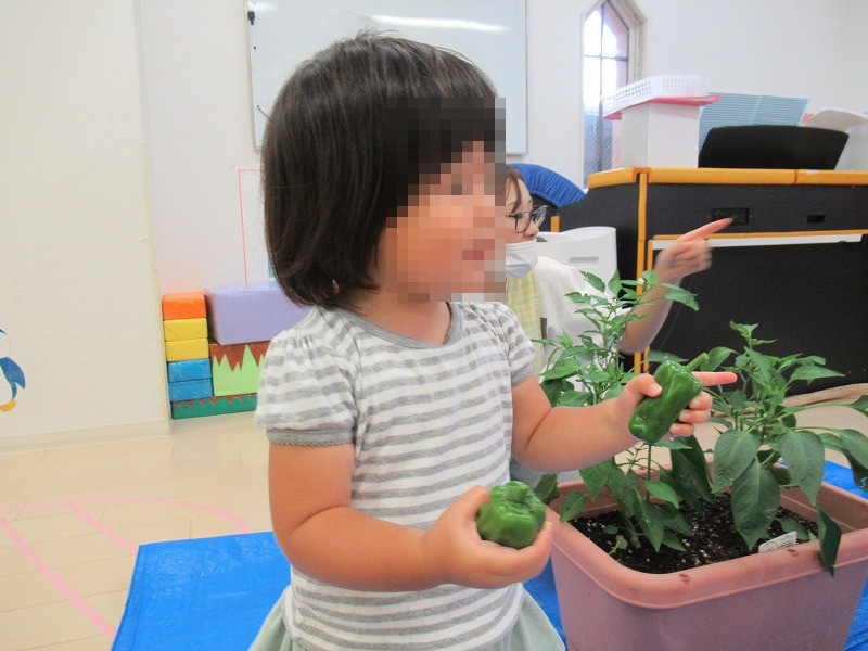 先月にプチトマト、キュウリ、ピーマンの苗を植えました。毎日皆で交代でお水をあげて〜♪一番最初にピーマンができました(^-^)/