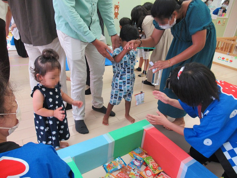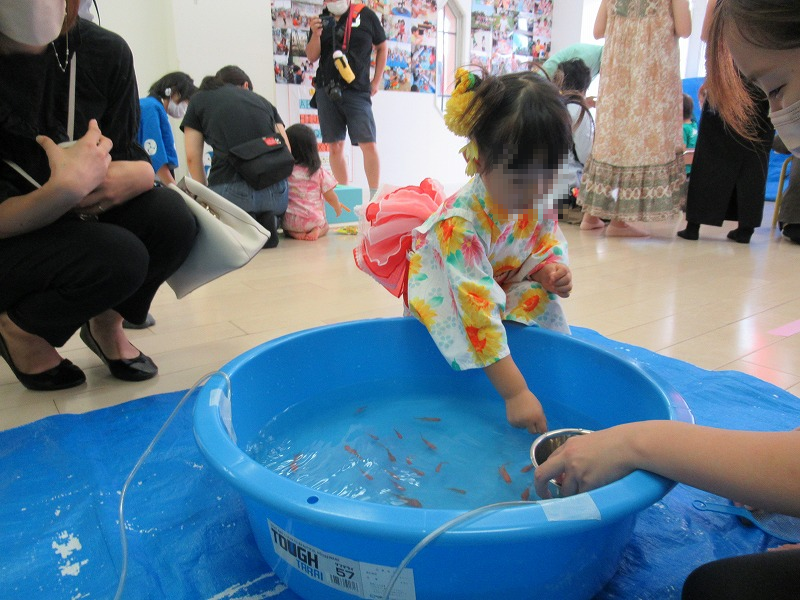金魚すくいはもちろん本物の金魚をすくいます。今年は上手に金魚をすくえた園児が続出!すくえた金魚はほぼ強制的にお持ち帰り、お母さんごめんなさい(^-^;)