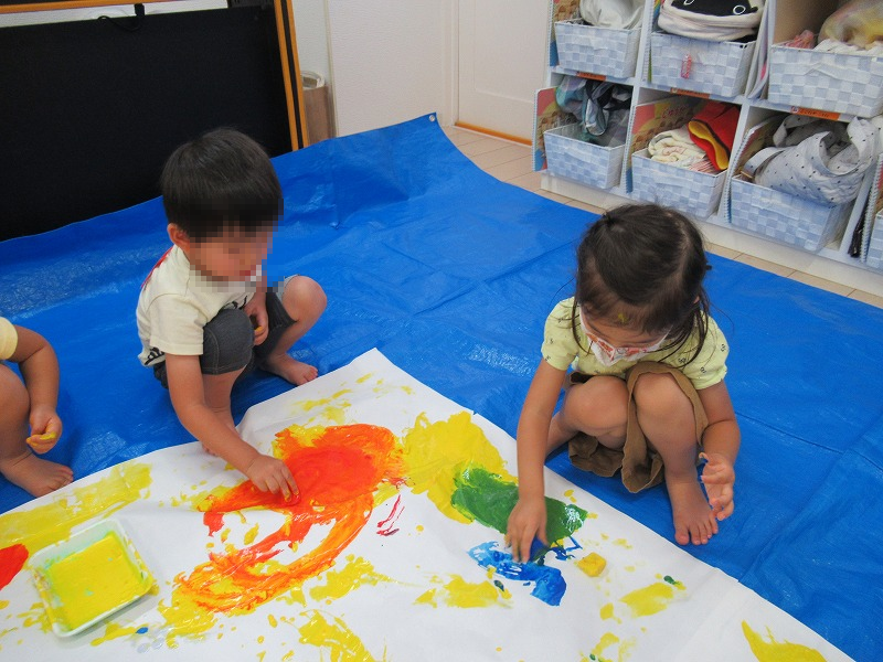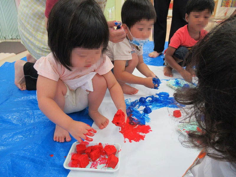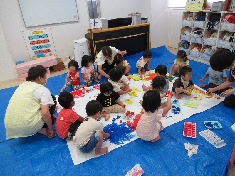 冷たい氷での色塗り♪子ども達の不思議そうな表情が楽しそうな表情に変わります(^-^)。遊び終わった後の絵の具だらけになった子ども達はシャワータイム♪