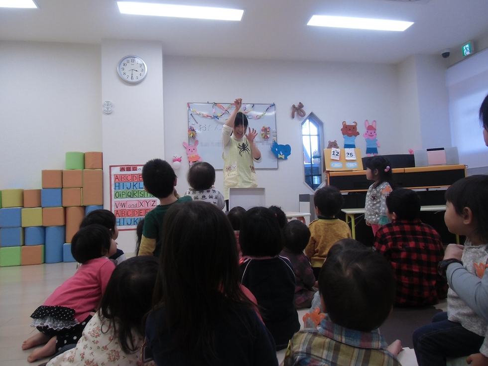 二番手はWelinaのかくし芸王!M先生!今月は「蜘蛛の糸ブラブラなぁに」です。糸の先から蜘蛛が現れると(左下写真)、ヤギ、キリン、お魚、来年の干支ヒツジと次々動物達が現れます。「うわ〜っ、すごーい」(^0^)。