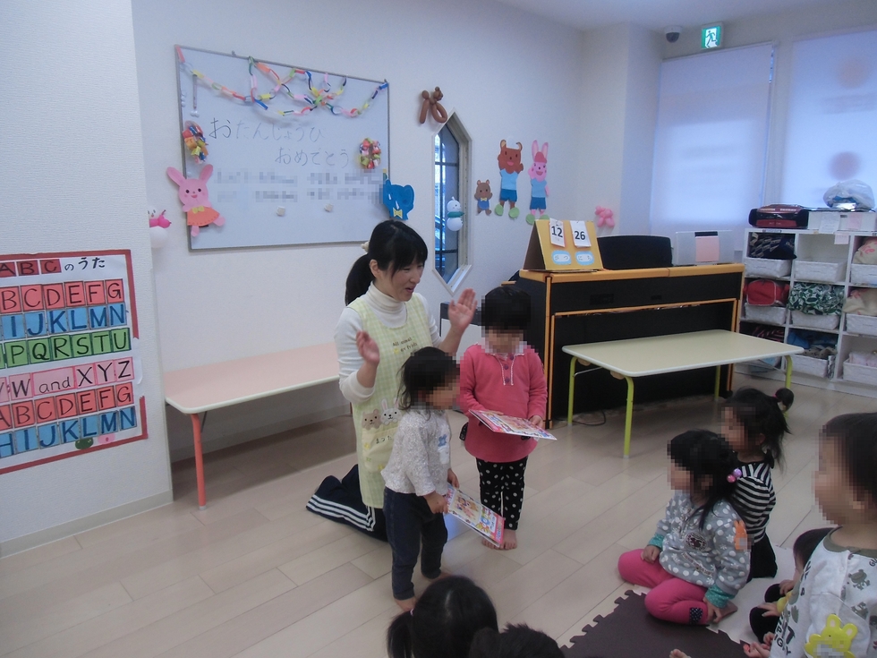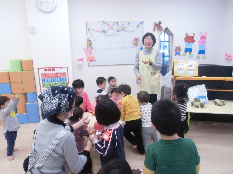 はじまりましたお誕生日会恒例の先生によるかくし芸披露(^0^)。