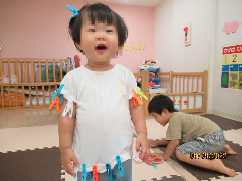 写真は赤組お姉さんに洗濯バサミでオシャレさせてもらった黄組(0才児)さん、すごく嬉しそう(^-^)。