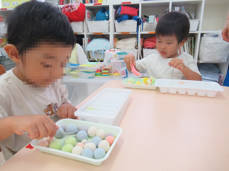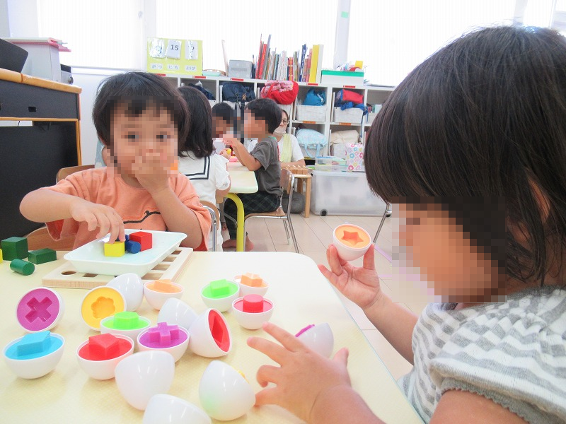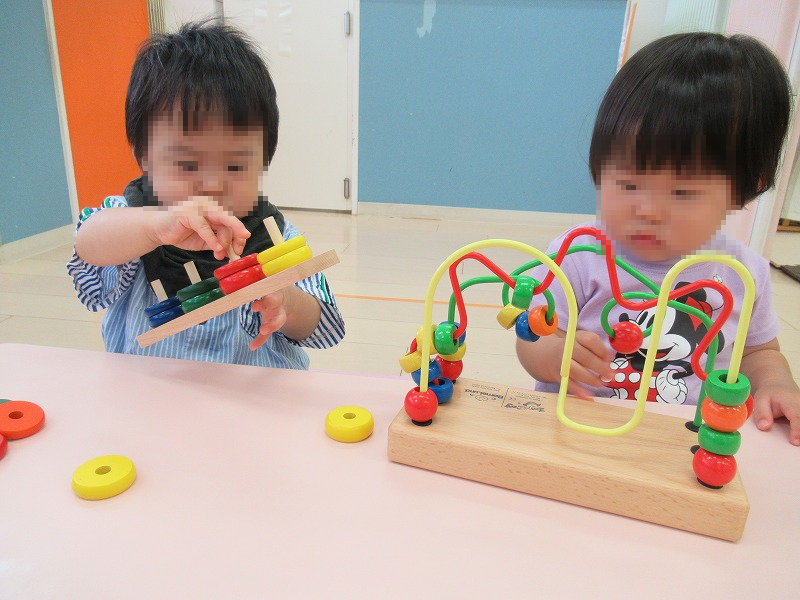 上の写真は0才児コンビ。真剣な表情でモンテッソーリ玩具に挑戦しています。下の写真は1才児(左)と2才児(右)です。幼児だと思って侮るなかれ、子ども達の集中力って大人顔負け、すごいんですよ!スイッチが入ると、途中で投げ出す子なんて一人もいないんです(^o^)。
