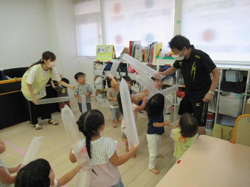 写真はじゃれつき遊び(ふれあい遊びともいいます)のハード版(笑)。設定保育「ちゃんばらごっこ」。