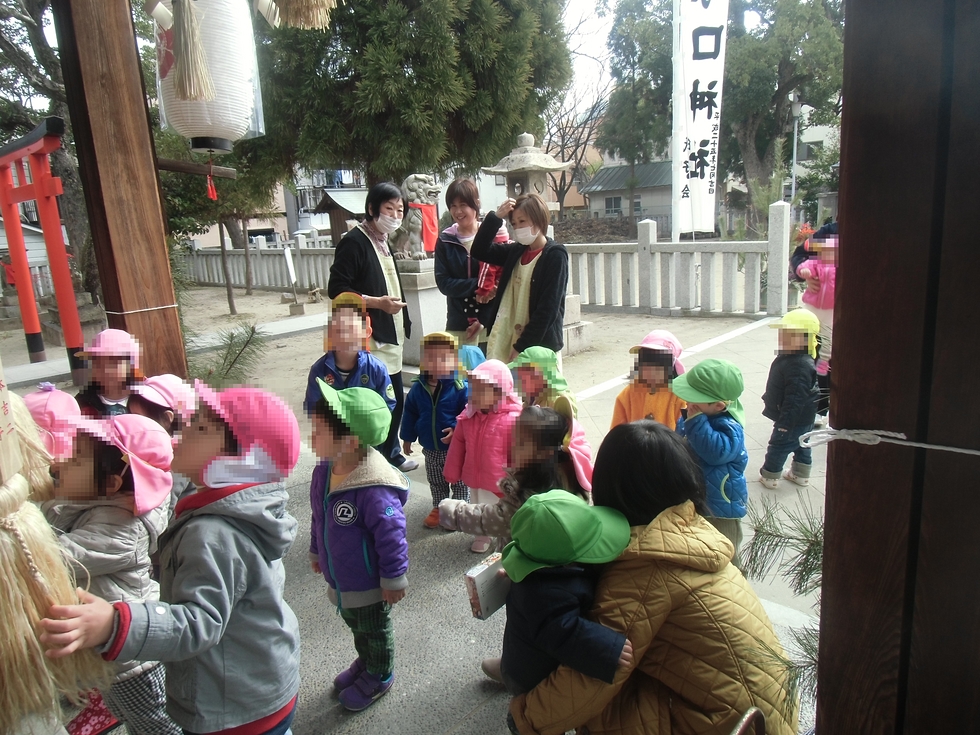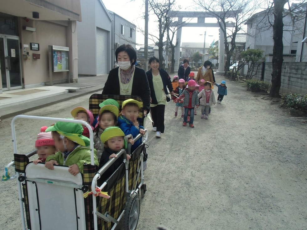 エアバス(避難車のことをWelinaではなぜかエアバスと呼びます・笑)に乗って、お散歩ロープをしっかり持って「塚口神社」に到着です。(左下写真)