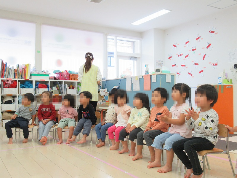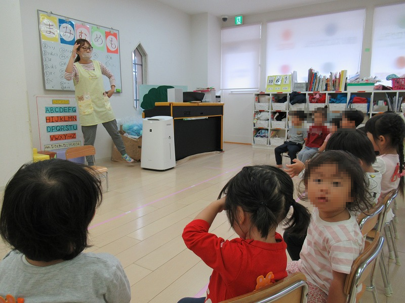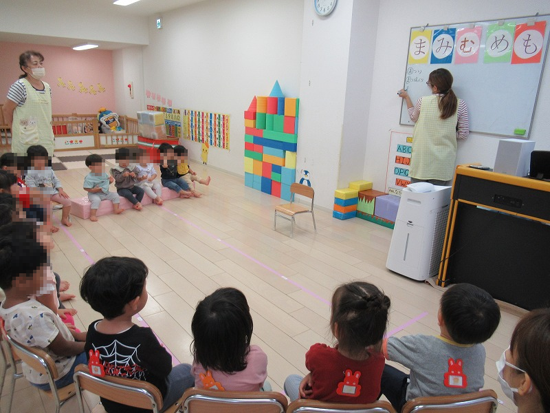 今週は「ま行」でクイズ(^-^)「ま」のつく言葉は?「まつりー!、まつぼっくりー!ママぁー!・・・」どんどん正解が出てくる赤組(2才児)さんはニコニコどや顔(笑)。オレンジ組さんも最近はポツポツ正解を叫べる?笑 ように(^o^)黙ってみている黄組さんも興味津々(興味がなければ立ち上がってウロウロしだします 笑)