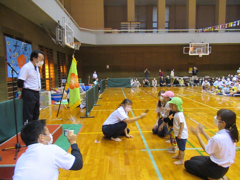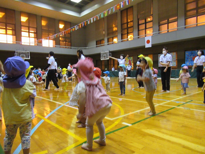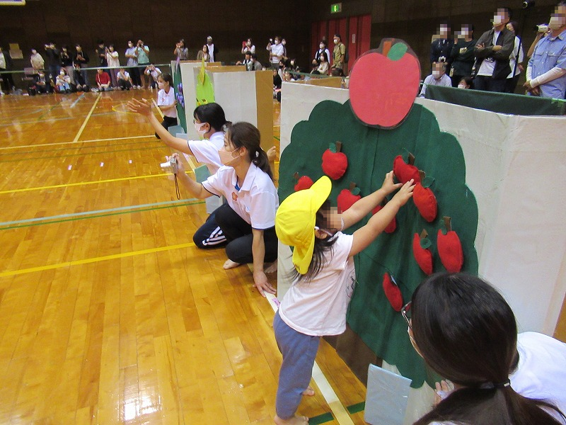 準備運動でダンスをしたら、最初の競技はペッタン競争実らせよう(^-^)ブドウ、バナナ、リンゴをそれぞれの木に実らせます♪