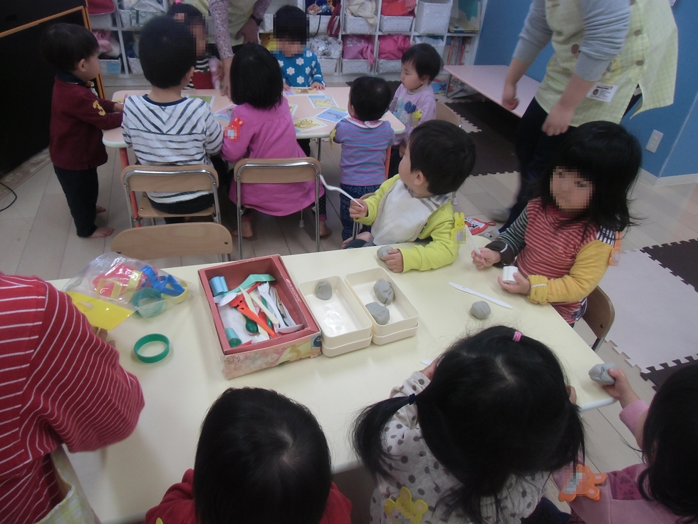 この日の午後の設定保育は「かるた取り」「ねんど遊び」「ブロック遊び」に分かれました。(右下写真は「かるた」と「ねんど」です)