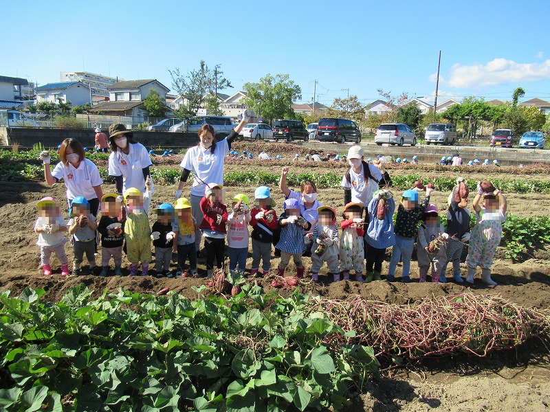 収穫したお芋を手に嬉しそうな子どもたち。カメラを前に、はい、チーズ!