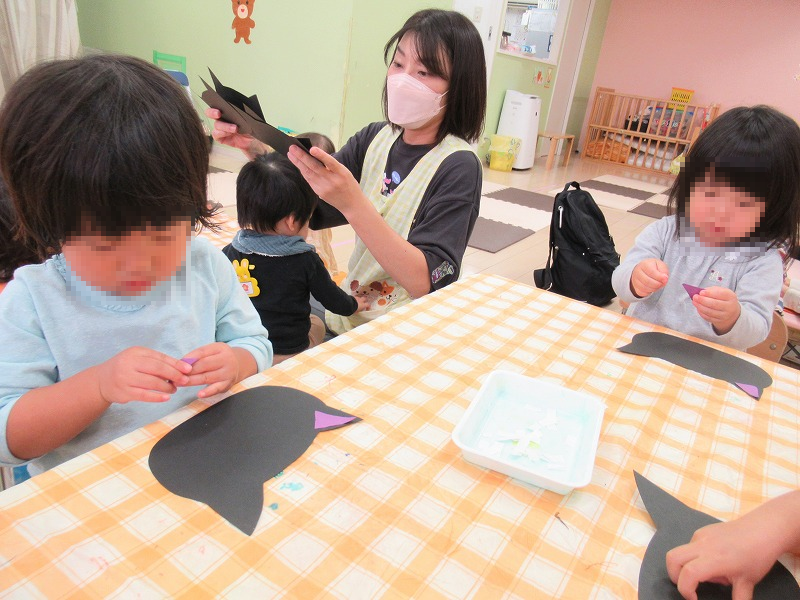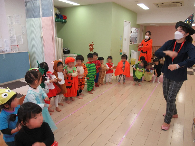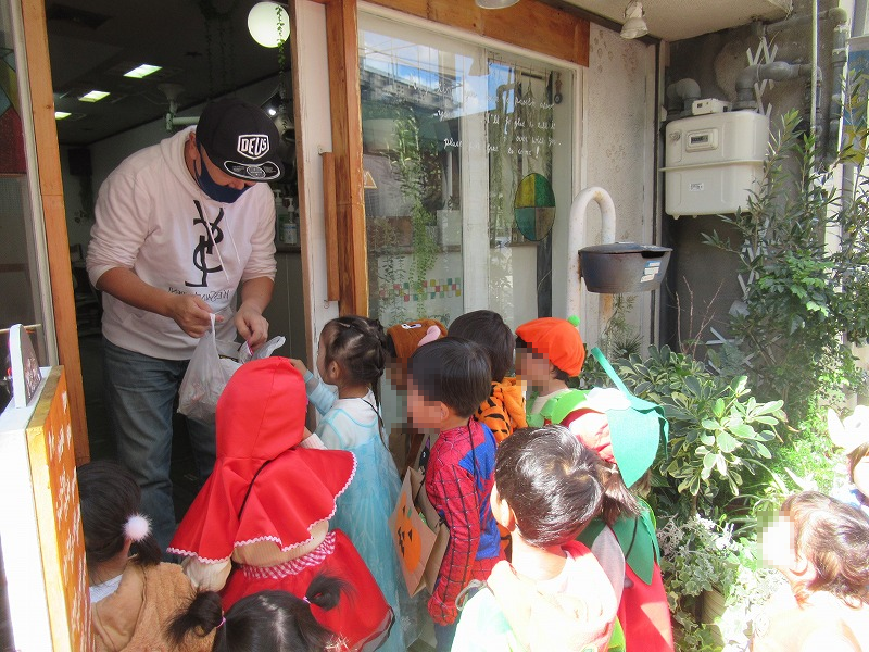 今週の英会話はハロウィンをテーマに「Trick or Treat!」。保育室でたくさん練習をしたら、先週の工作の時間に作ったお菓子回収バックを持って町内に出発ー(^o^)/