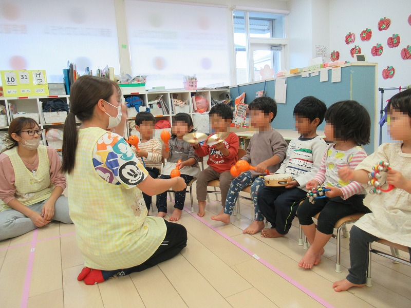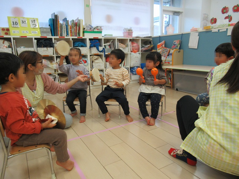 ハンドベル(鈴)でシャンシャンシャン♪カスタネットはタントンタン♪マラカスでシャカシャカシャカ♪タンバリンでチャカタンシャカタン♪シンバルンでバアーン♪
