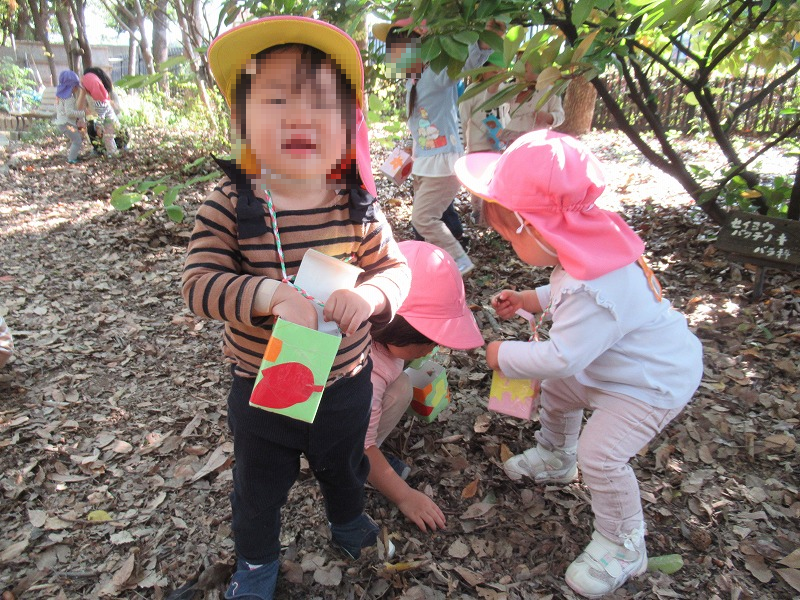 写真はたくさんのどんぐりを集めて満足げな黄組(0才児クラス)さん(^-^)。