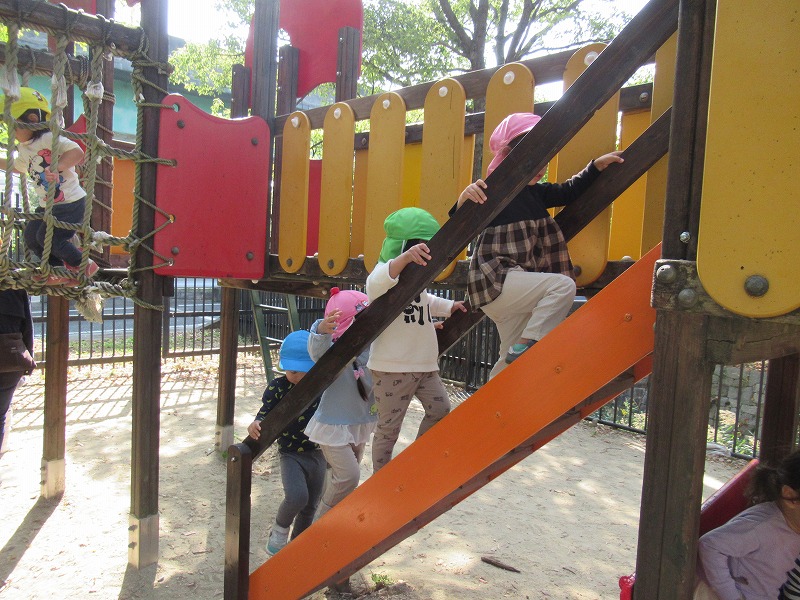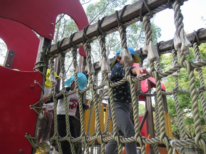 どんぐりをたくさん集めた後、赤組(2才児クラス)さんはアスレチック遊具に挑戦しにいきました。爽やかな秋晴れの公園、気持ちよかったねー!
