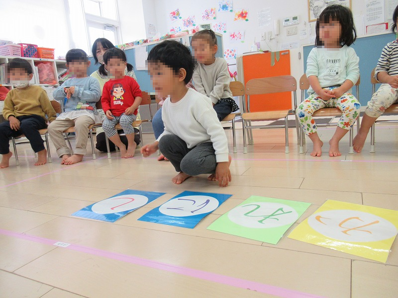子ども達は笑顔で頑張りました。写真は英会話、文字遊び、体操です。