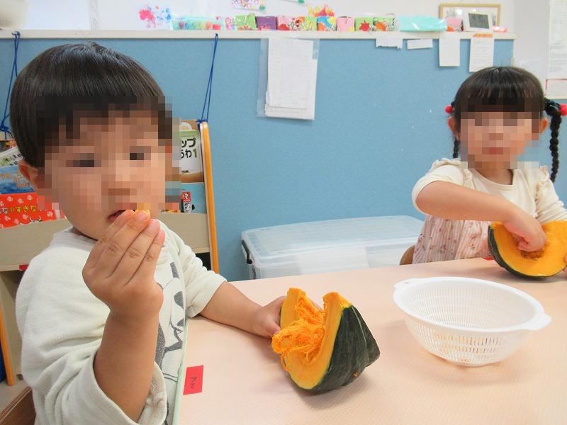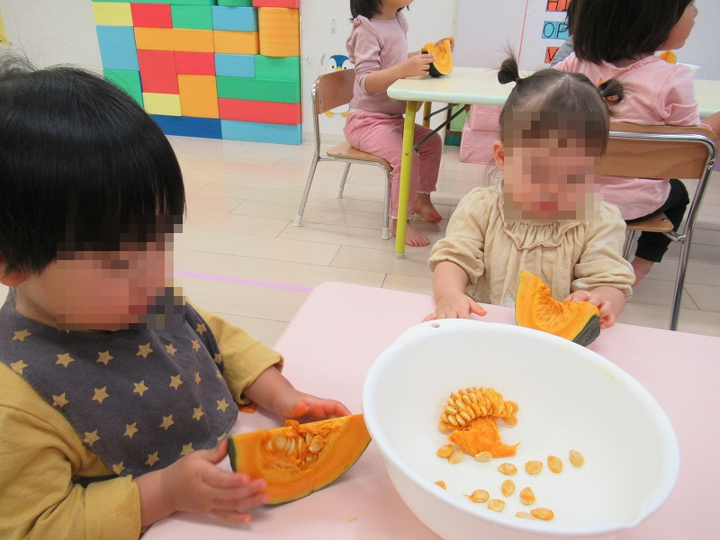 この日はかぼちゃの種取り(食育)をしました。初めは恐る恐る種を取る子天使ちゃん達(笑)。