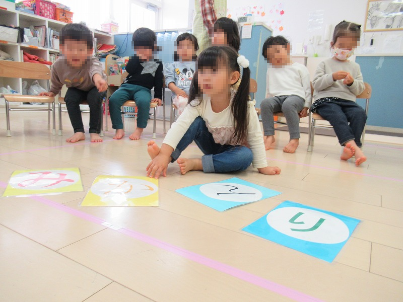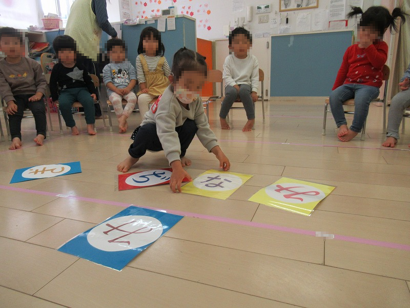 今週の文字遊びは名前探し♪4月から始まった文字遊び、このころになると赤組(2才児クラス)さんは自分の名前の文字がわかるようになってきました(^-^)。