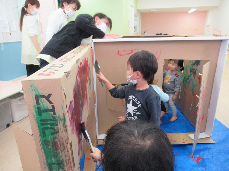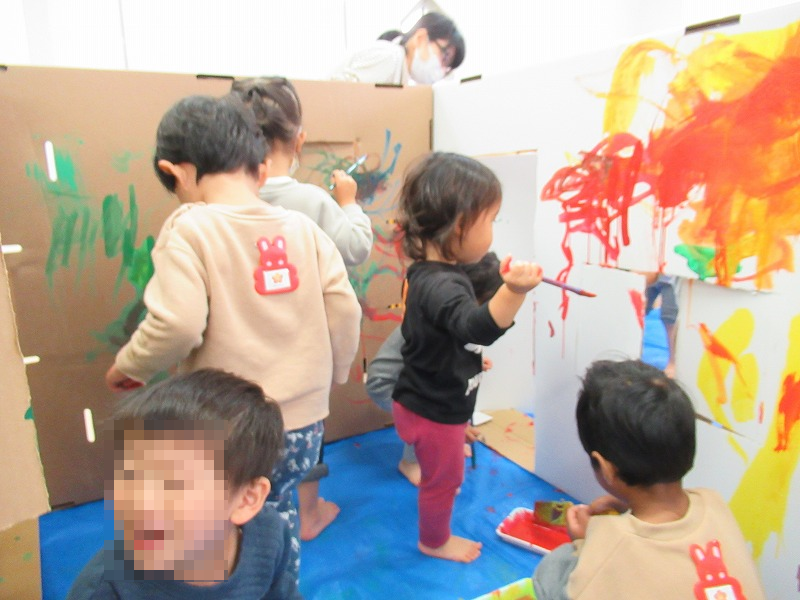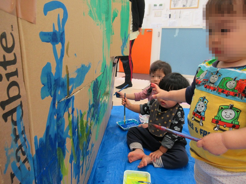 大きな壁に絵具をたっぷりとしみ込ませたハケやフデで芸術心をぶつけます(笑)。年齢クラス関係なく子天使ちゃん達一丸となって楽しんでいます(^o^)/