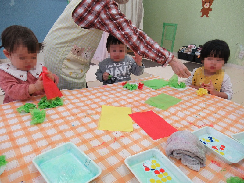 右下の写真は今週の工作(0才児さんと後期1才児さん)。