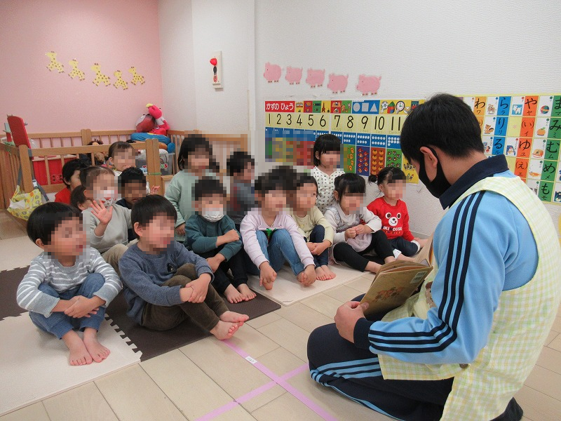 写真は参観日、今回は2回に分けて行いました。いつもは元気に保育に参加出来ている0,1才児さんにはお母さんがいてると甘えて泣いちゃう子も、それでいいんです(^-^)